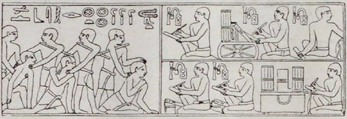 Хорошенькія, раскрашенныя фигурки изъ дерева (на рис.30), происходятъ изъ гробницы начальника округа Мезехти у Сіутъ; на двухъ деревянныхъ доскахъ изображены (10 рядовъ по 4 человѣка) стрѣлки изъ лука и копьеносцы; они были положены въ гробницу умершему для того, чтобы онъ могъ командовать своимъ войскомъ и послѣ смерти. Копьеносцы со своими покрытыми кожею щитами окрашены въ красный цвѣтъ и охарактеризованы, благодаря этому, какъ египтяне; стрѣлки же, съ ихъ длинными луками и 4 тростниковыми стрѣлами у каждаго въ рукахъ, частью египтяне, частью ливійцы; офицеры стояли на особой дощечкѣ.