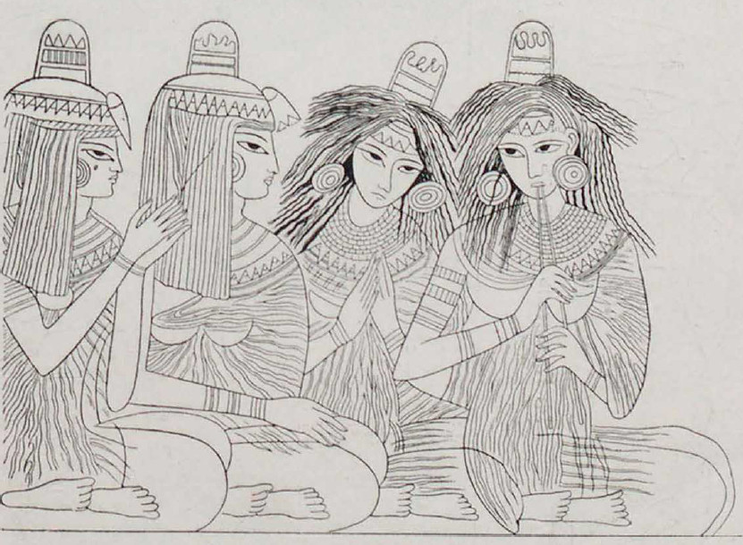 На рис.152 мы видимъ ассирійскій квартетъ: арфы, бубенъ и кимвалы; музыка сопровождаетъ отправленіе на охоту; рельефъ взятъ изъ дворца Санхериба и Ассурбанипала въ Куюнджикѣ. Музыканты одѣты въ длинныя, обшитыя бахромой туники, опоясанныя широкими поясами; у нихъ обычная длинная борода, но необычная прическа волосъ на головѣ; вѣроятно и въ тѣ времена художники любили оригинальные уборы!