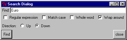 Опция Find... из меню Edit выводит на экран показанное выше диалоговое окно. Установки по умолчанию - это down (следующее) и Wrap around (продолжить с начала), означающие, что поиск в буфере идет по направлению к концу от текущего положения курсора и что, если конец буфера будет достигнут раньше, чем будут найдены искомые символы, поиск продолжится с начала этого файла. Если выбрана опция regular expression (регулярное выражение), введенные вами символы будут расцениваться программой как регулярное выражение. Опции Match case (учитывать регистр) и Whole word (только слово целиком) действуют так, как вы и предполагаете.