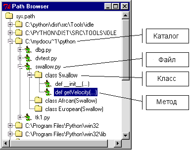 Двойной щелчок мышкой по каталогу выводит на экран список модулей. Двойной щелчок по одному из них (т.е. swallow.py на картинке выше) загружает этот файл в окно редактора файлов File Editor, а также отображает список классов в этом файле. Двойной щелчок по одному из классов (т.е. Swallow на картинке выше) выводит список методов, определенных для этого класса (а также перемещает вас к началу определения этого класса в окне File Editor). Если дважды щелкнуть по методу, откроется редактор файлов, в том месте, где приводится описание этого метода. Также возможно один раз щелкнуть по нужному знаку "+" слева, чтобы перейти к следующему уровню в браузере путей без открытия окна редактора файлов.